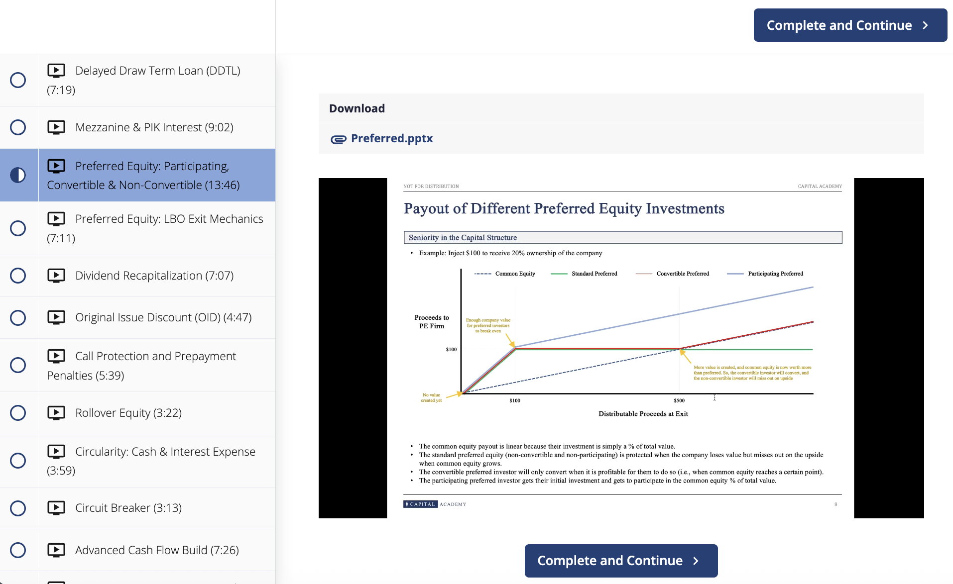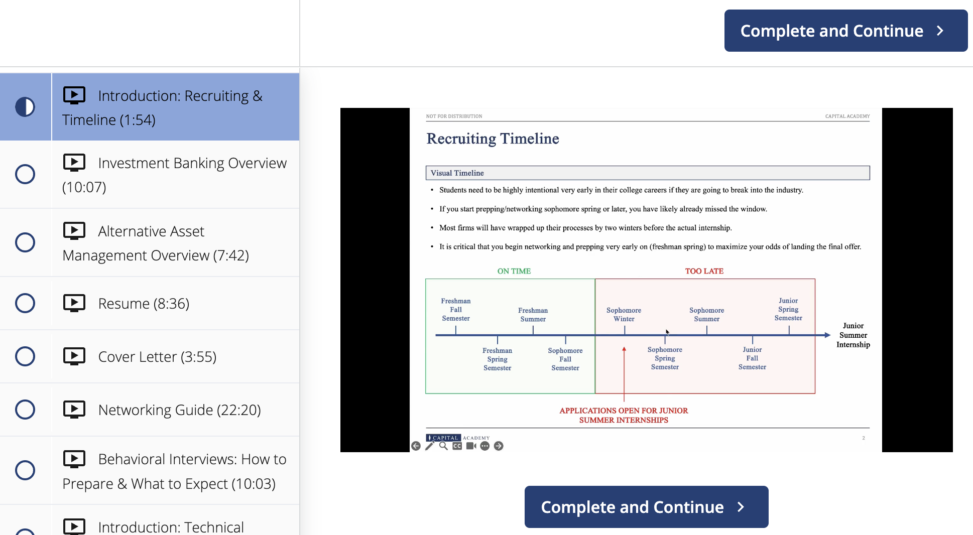 Whether you are a college freshman just learning the fundamentals or a young professional preparing to start your full-time job in the industry, Capital Academy provides instruction across the spectrum, from accounting and valuation to the advanced construction of industry-level board materials and investment memoranda.
